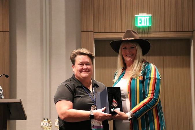 Lisa Secrest accepts Memorial Award from Molly Romick in honor of Cammie Symonowicz